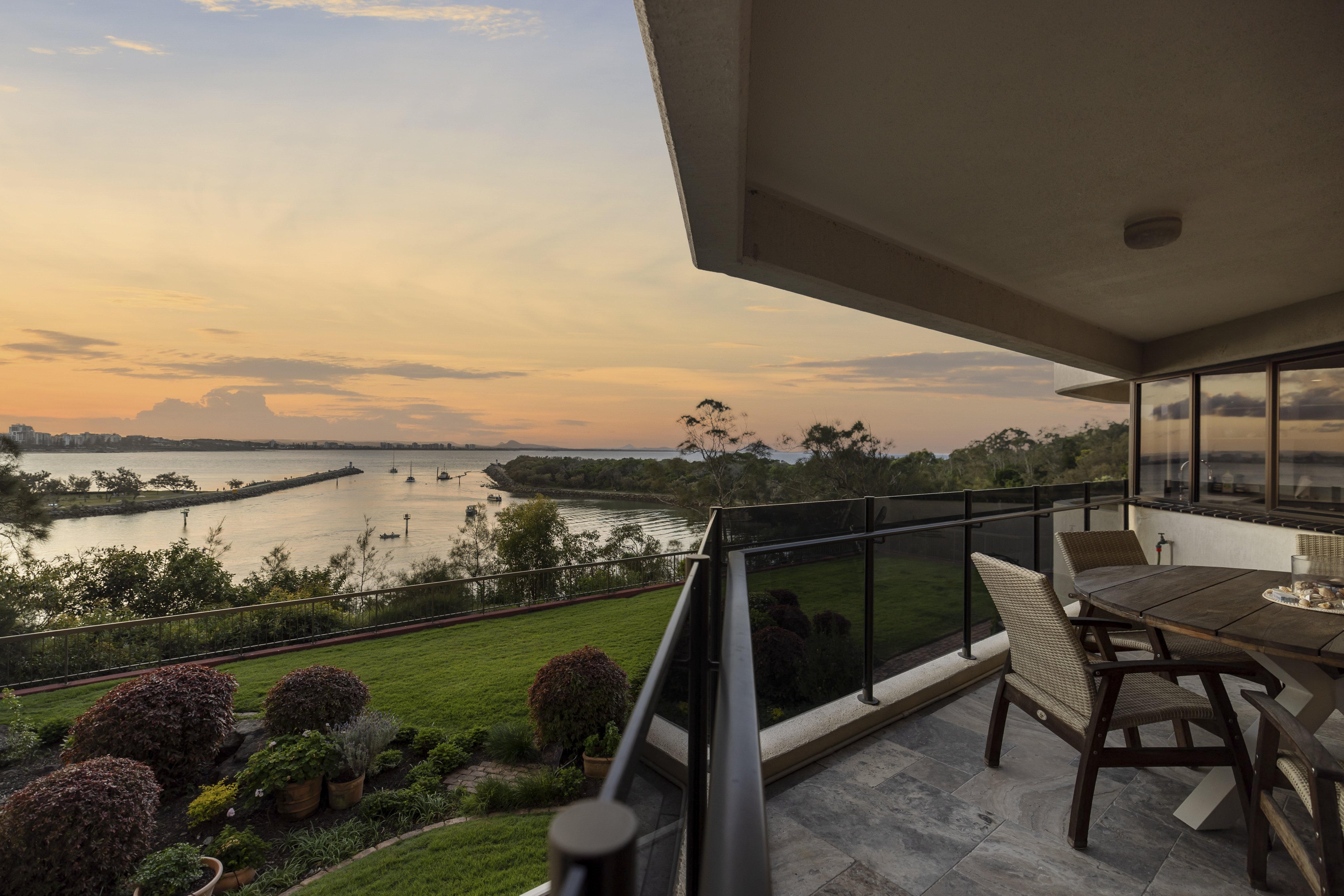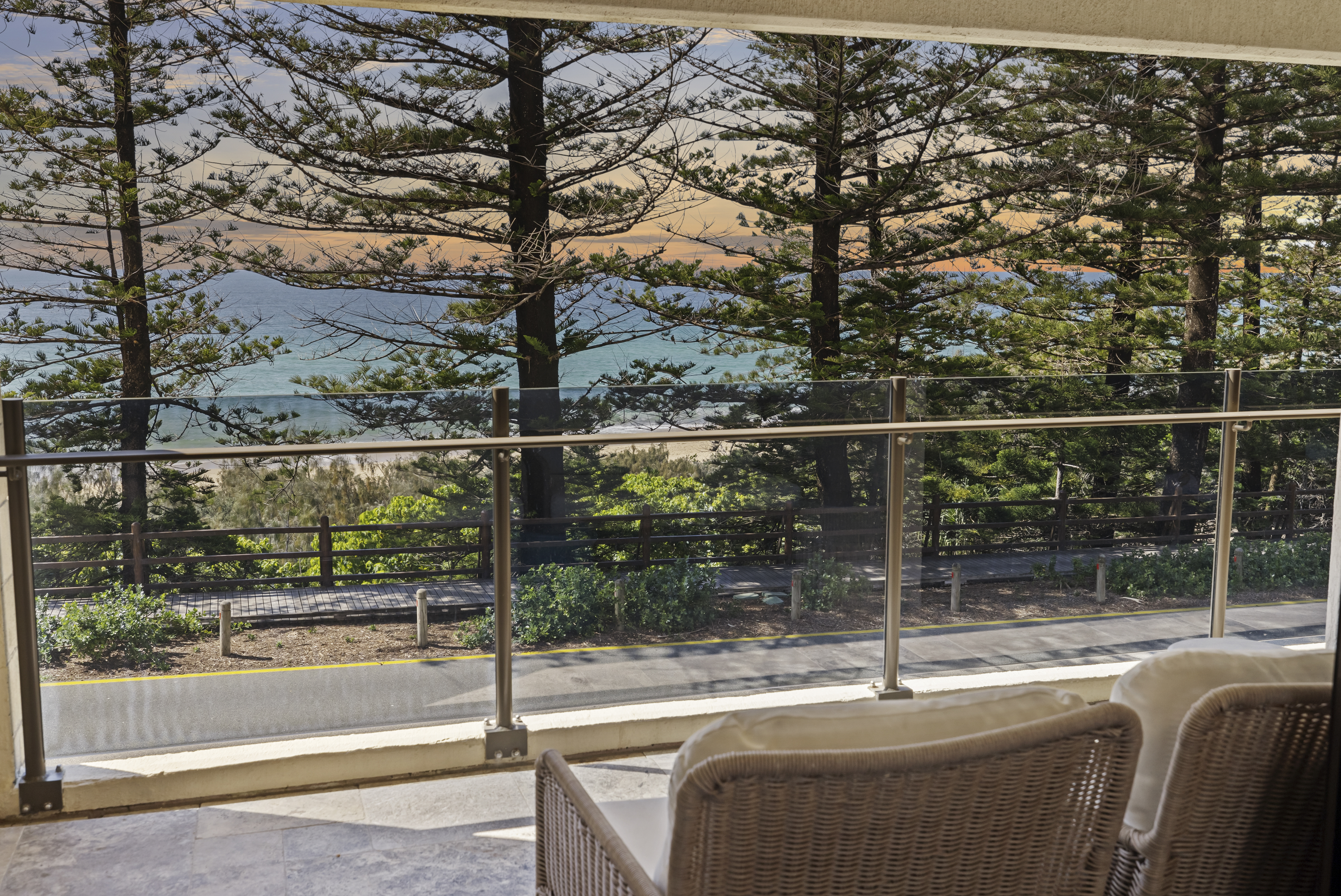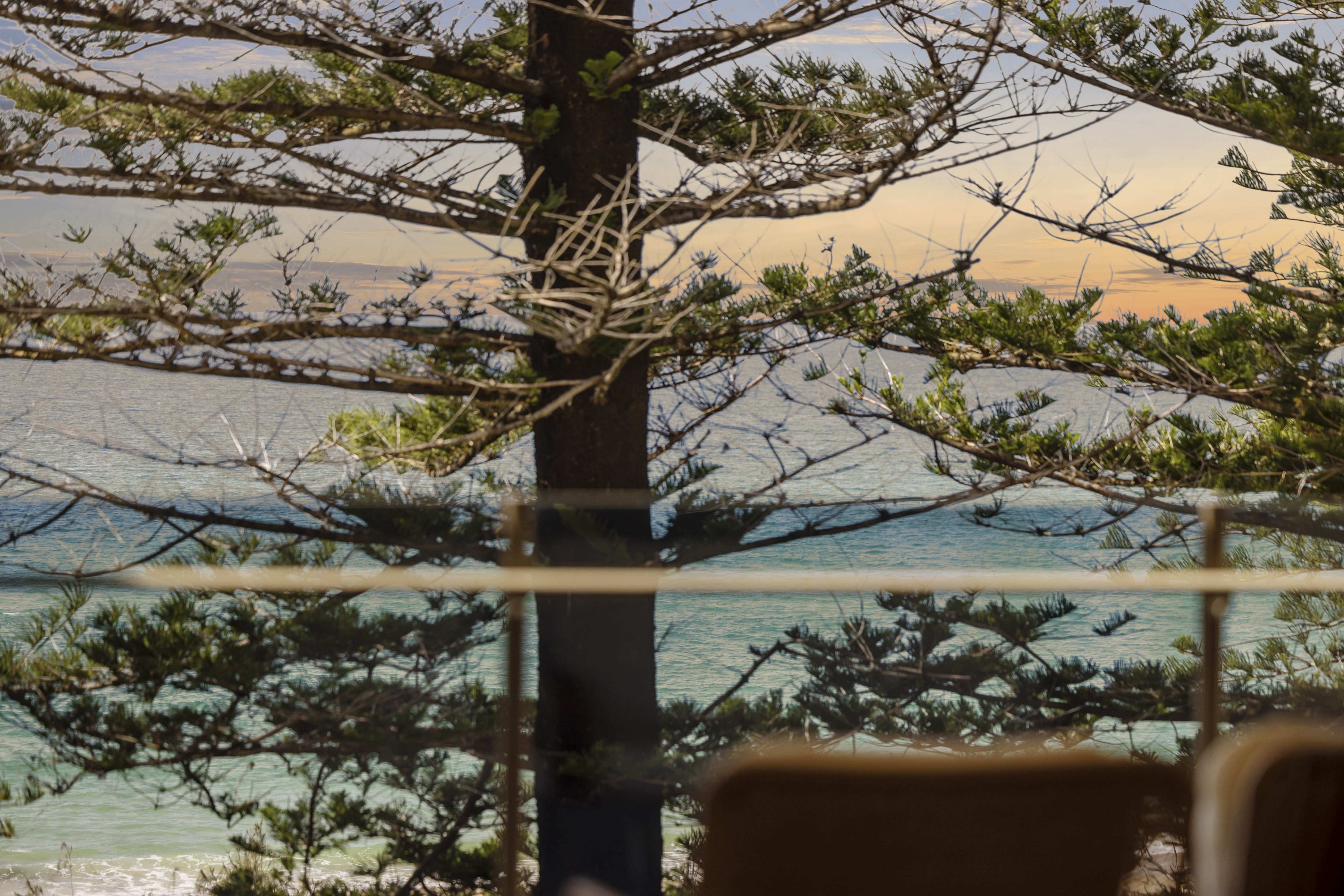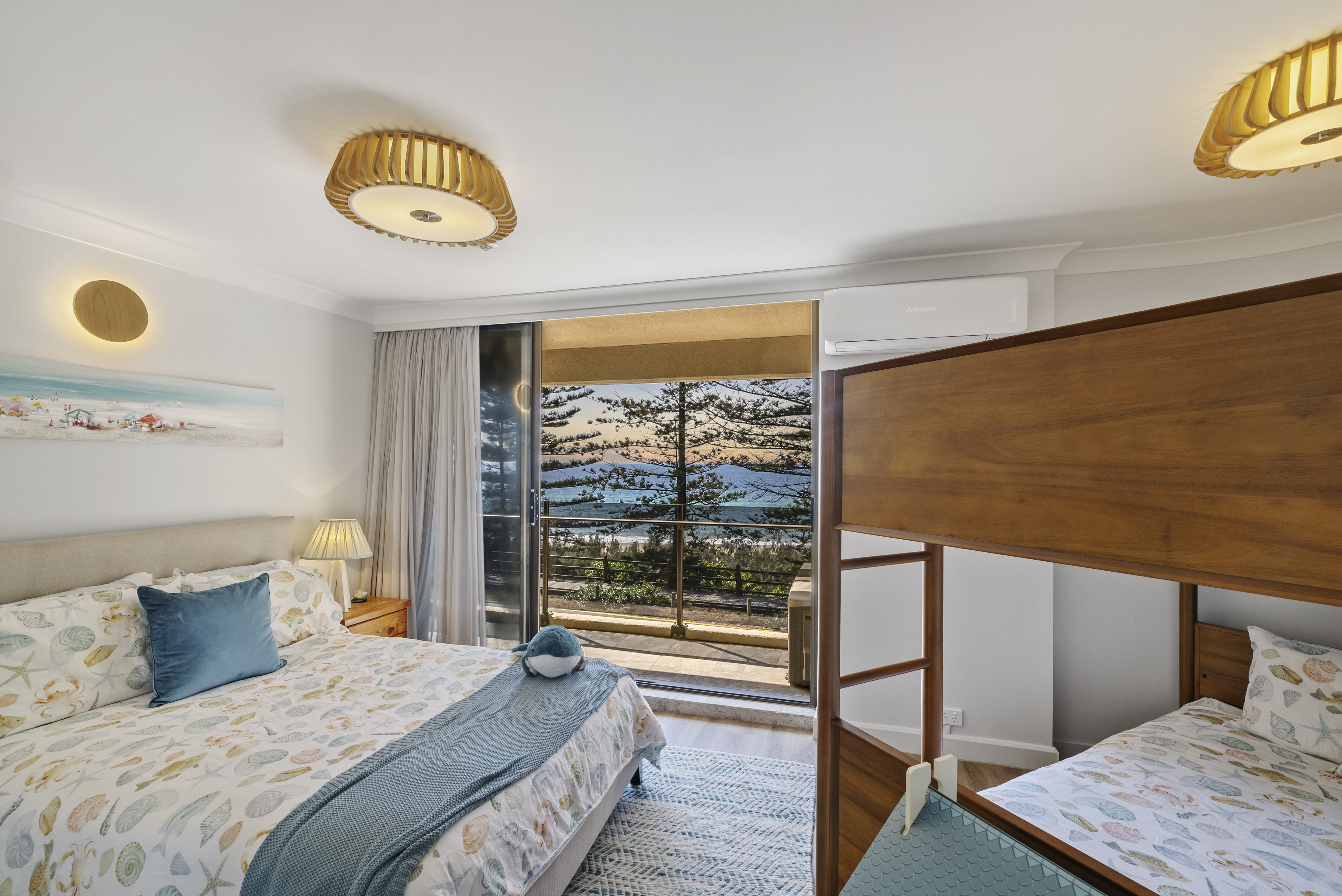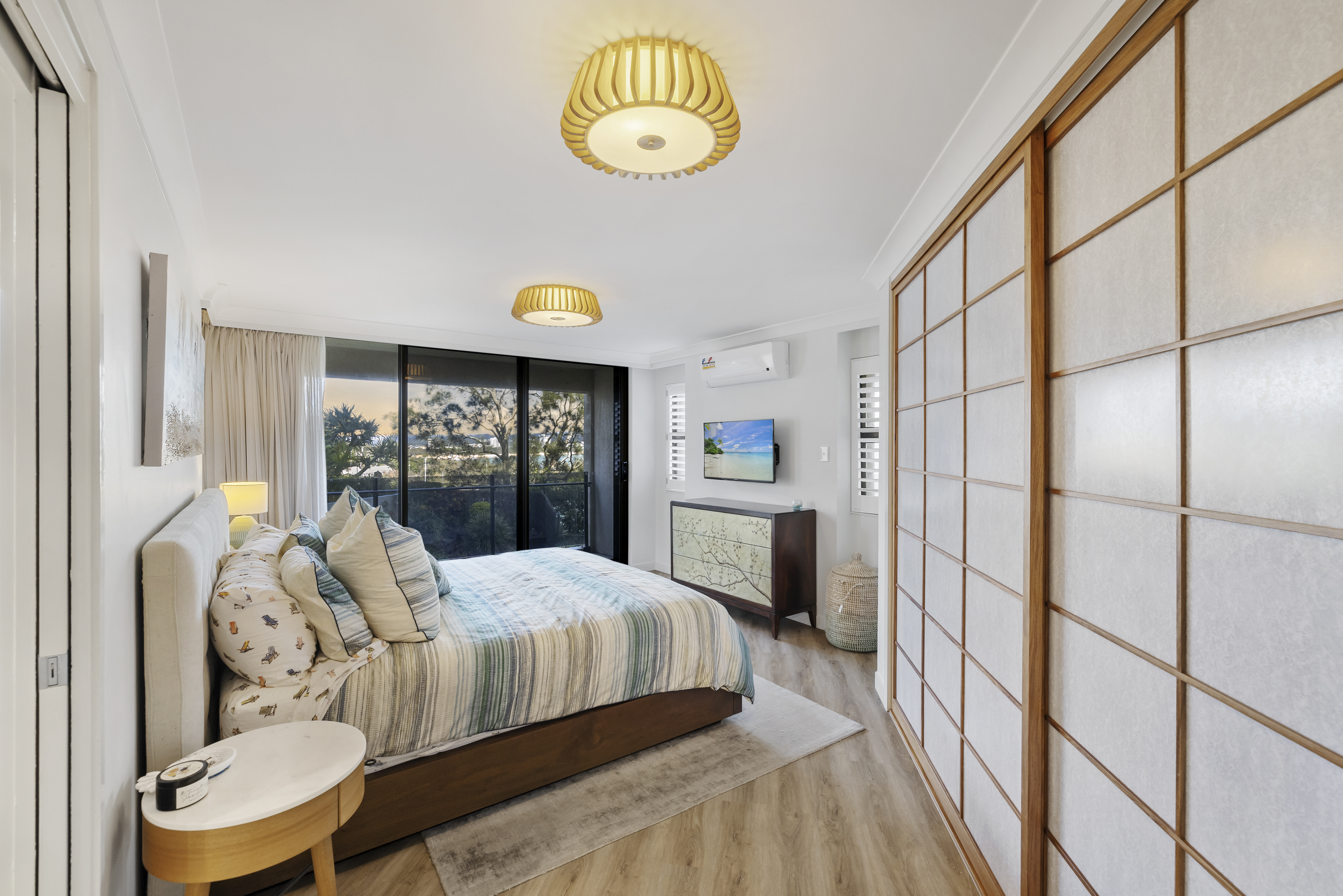 The second bedroom, located on the eastern side of the unit, offers an idyllic retreat for guests to revel in breathtaking sunrises or sunsets while maintaining their privacy. Complete with large built-in robes and direct access to the balcony, this space ensures convenience and comfort.